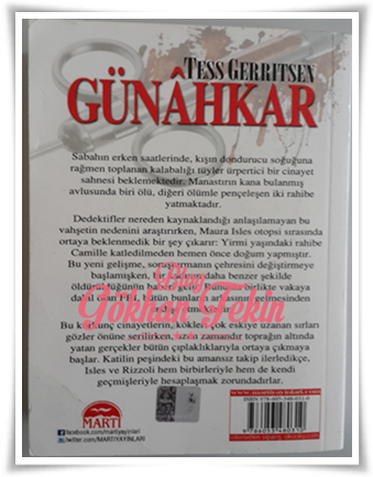 Ayrıca bu kitap Tess'in Rizolli/Isles serisinin bir parçası. Ben Tess'i "Siliniş" adlı bir kitabı ile tanımıştım. Sonradan öğrendimki ; 11 kitaptan oluşan bir serinin parçasıymış. "Günahkar"'da bu serinin bir parçası. Geriye kalan 10 kitap'ı mutlaka okumalısın abi, Maura ve Jane'in daha ne maceraları var bir bilsen…