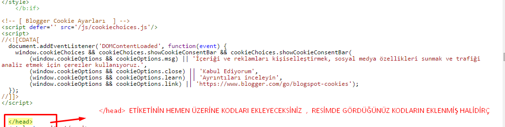 2. </head> kodunu bulduktan sonra aşağıda vereceğim kodları , </head> kodunun hemen üzerine yapıştırıp kaydedin. hepsi bu kadar.
