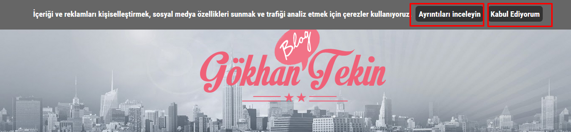 Yukarıdaki eklentiyi sitenize uyguladıktan sonra sitenizin en üst kısmında aşağıdaki resimdeki gibi 2 adet uyarı göreceksiniz ”Ayrıntıları İnceleyin” ve ‘‘Kabul Ediyorum” uyarıları göreceksiniz bunu gördüğünüz takdirde eklentiyi kurmuşsunuz demektir. Oradaki Kabul ediyorum butonuna tıklayın veya tıklamayın size kalmış.