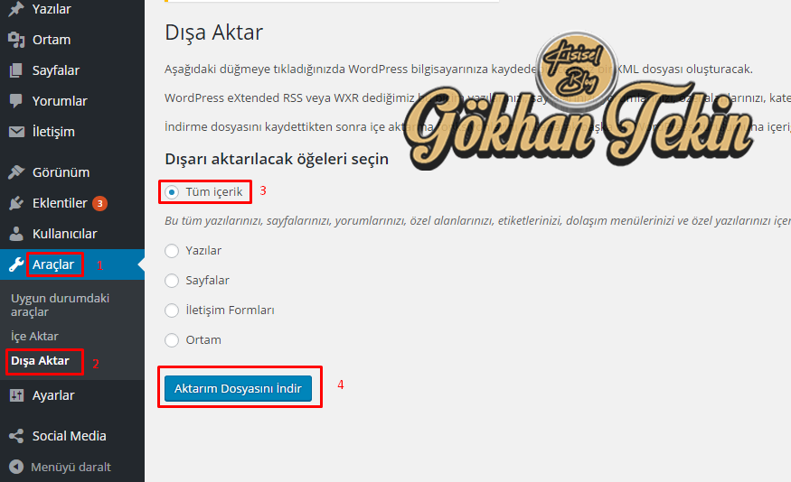 Blog yazmaya ilk olarak blogspot ile başlamıştım. Daha önce yaklaşık 3,5 yıl sonra wordpress’e geçtim. Neden wordpress’e geçtiğimi bloggokhantekin artık wordpress’te başlıklı yazımda detaylı olarak yazdım. Aşağıdaki resimdeki gibi wordpress olan sitenizin yedeğini aldıktan sonra, wordpress sitenizden aldığınız yedeği, blogspot ile uyumlu hale getirmek için.